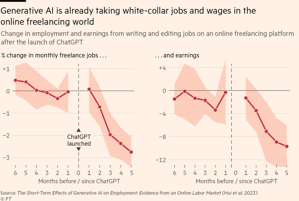 Por otra parte, un estudio detallado en una plataforma de trabajo independiente en línea después del lanzamiento de ChatGPT el año pasado arrojó resultados significativos. Los redactores publicitarios y diseñadores gráficos experimentaron una disminución notable tanto en la cantidad de trabajos obtenidos como en sus ingresos, sugiriendo que la IA generativa no solo asume funciones laborales, sino que también devalúa el trabajo humano.