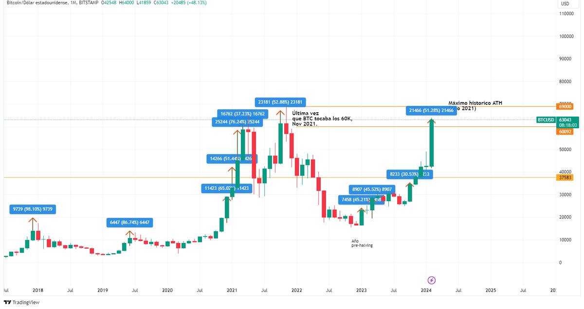 El precio de Bitcoin ha alcanzado recientemente los 64,000 USD, marcando un hito significativo que no se había visto en dos años. Este ascenso ha sido especialmente pronunciado en febrero, con un impresionante aumento del 51%, el más alto desde octubre de 2021. En resumen, el panorama para Bitcoin parece estar más vibrante que nunca, con los inversores y analistas mirando con expectación hacia el futuro.