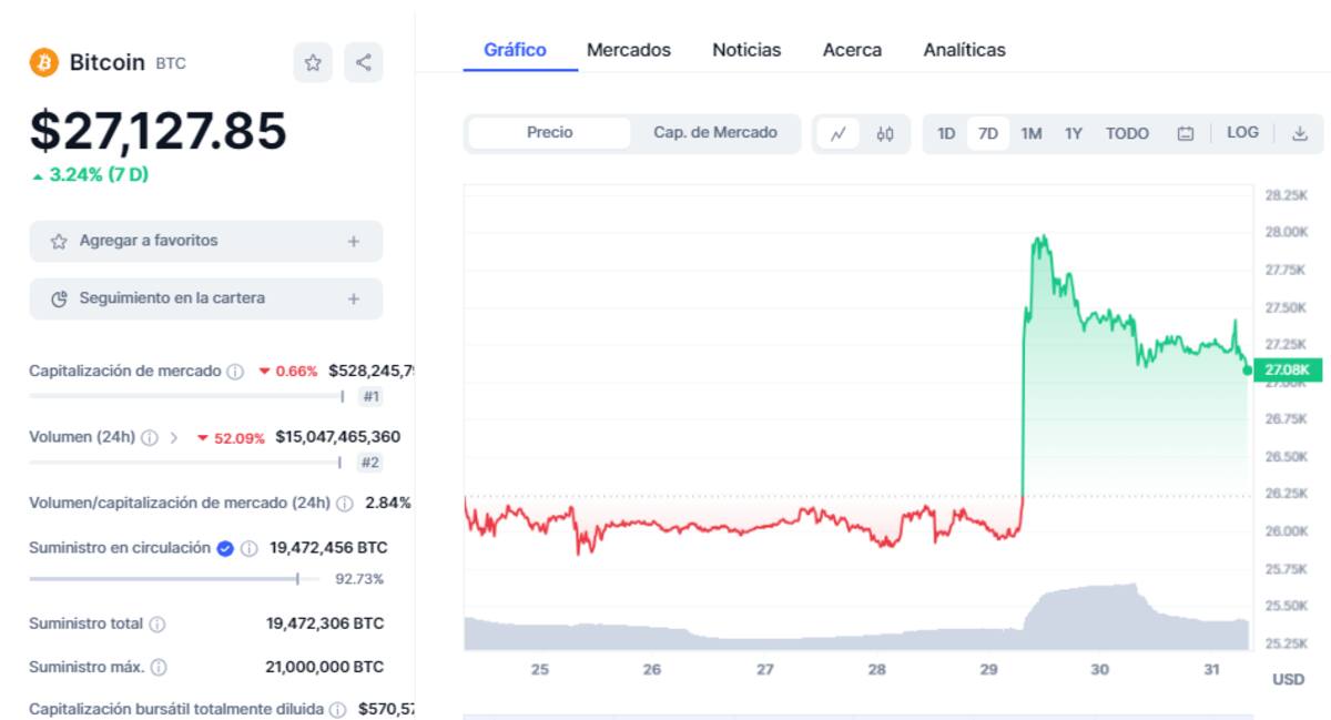 Por su parte, en CoinMarketCap, el precio de Bitcoin un incremento del 3,08% llegando hasta los $27,127 dólares por unidad, equivalentes a458,356 pesos mexicanos.