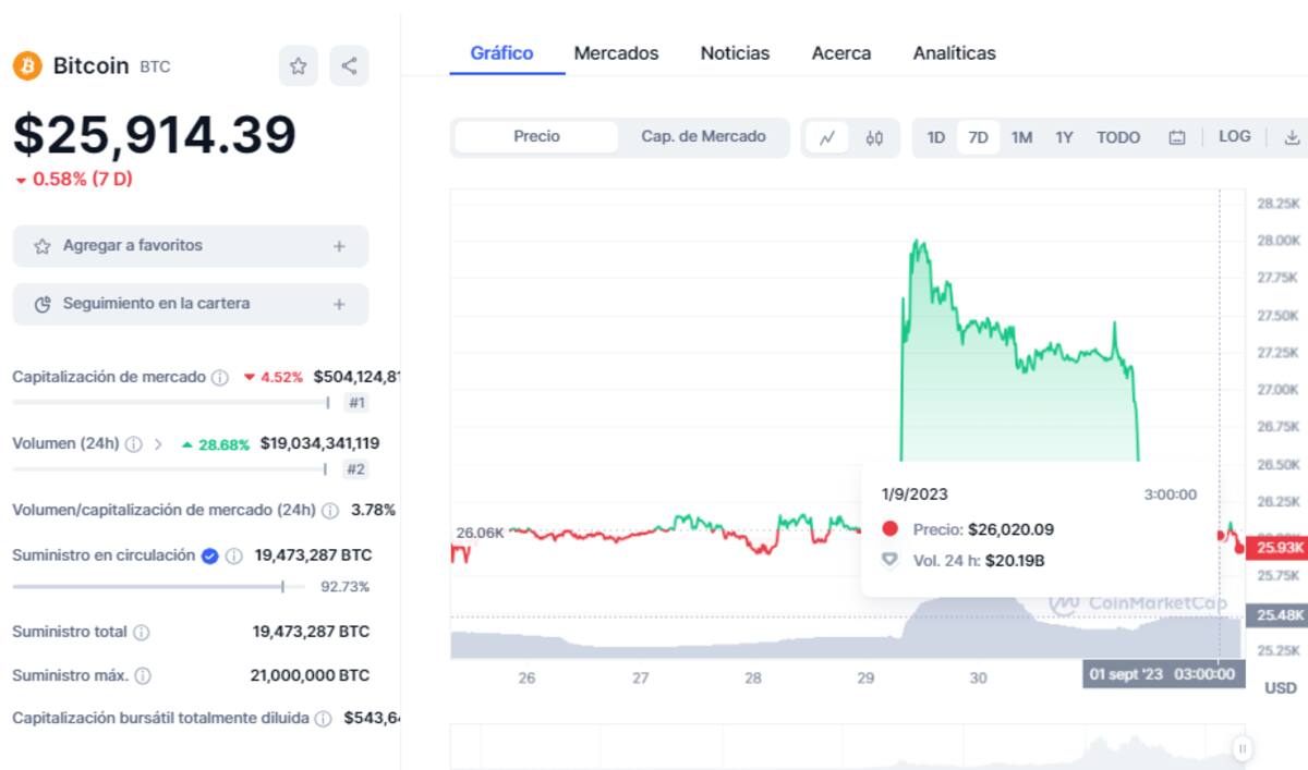 Por su parte, en CoinMarketCap, el precio de Bitcoin una caída del 4,35% llegando hasta los $27,127 dólares por unidad, equivalentes a458,356 pesos mexicanos.