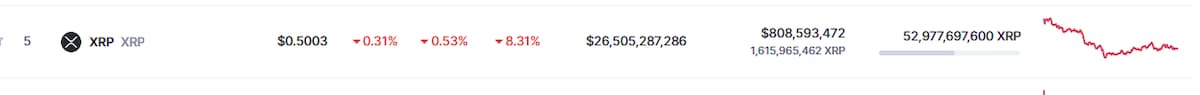La criptomoneda XRP, por su parte, en las últimas 24 horas, ha manifestado una caída del 2,89% estableciéndose en los 0,51 dólares por unidad, pero semanalmente manifestó una caída del 8,29%.