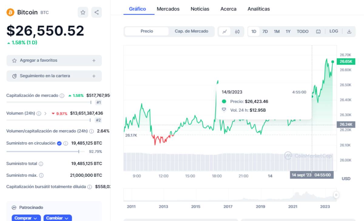 Por su parte, en CoinMarketCap, el precio de Bitcoin un incremento del 3,86% llegando hasta los $26,550 dólares por unidad, equivalentes a 450,383 pesos mexicanos.