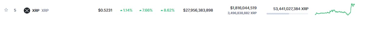 La criptomoneda XRP, por su parte, en las últimas 24 horas, ha manifestado una caída del 2,89% estableciéndose en los 0,51 dólares por unidad, pero semanalmente manifestó una caída del 8,29%.