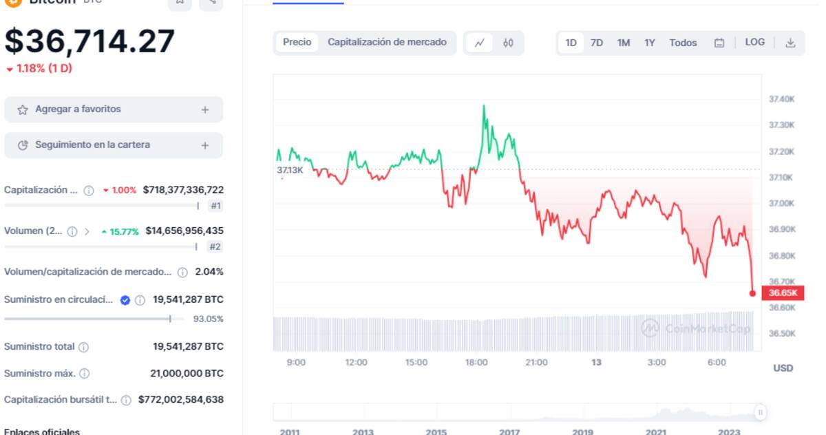 Por su parte, en CoinMarketCap, el precio de Bitcoin una caída del 1,55% llegando hasta los $36,714 dólares por unidad, equivalentes a 496,504 pesos mexicanos.