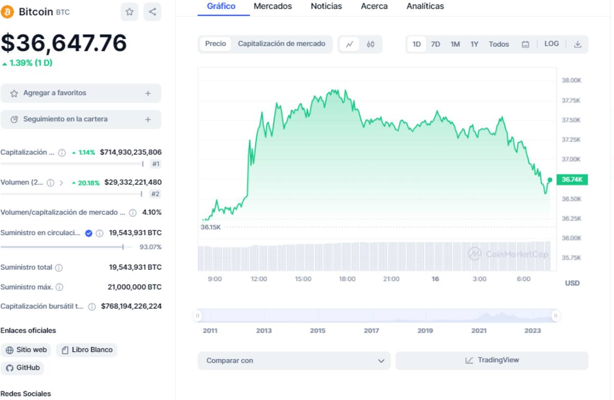 Por su parte, en CoinMarketCap, el precio de Bitcoin una caída del 1,55% llegando hasta los $36,647 dólares por unidad, equivalentes a 496,504 pesos mexicanos.