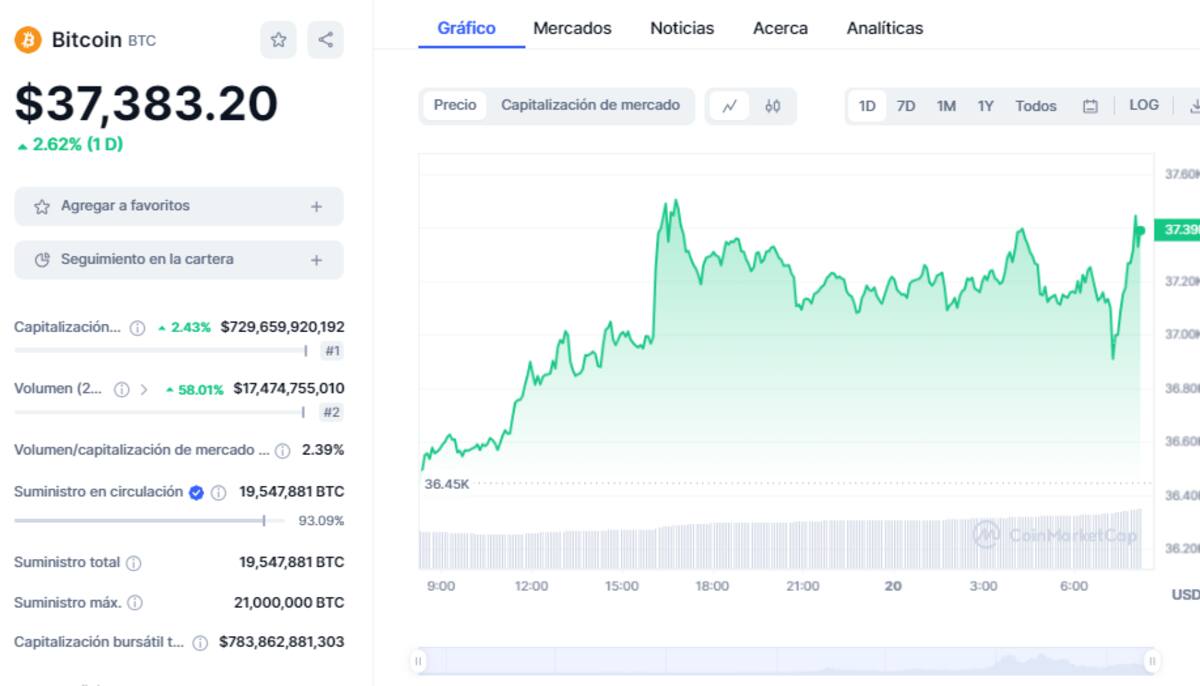 Por su parte, en CoinMarketCap, el precio de Bitcoin una caída del 1,55% llegando hasta los $37,385 dólares por unidad, equivalentes a 496,504 pesos mexicanos.