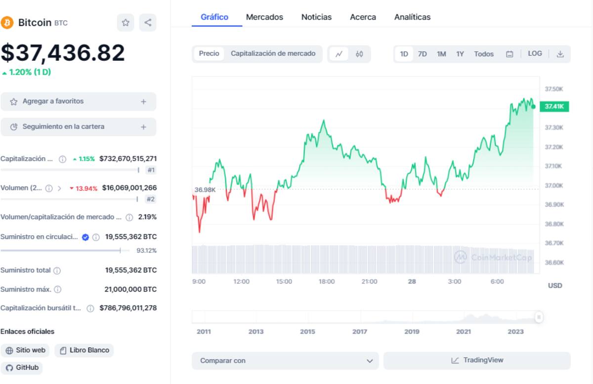Por su parte, en CoinMarketCap, el precio de Bitcoin una caída del 1,55% llegando hasta los $37,436 dólares por unidad, equivalentes a 496,504 pesos mexicanos.