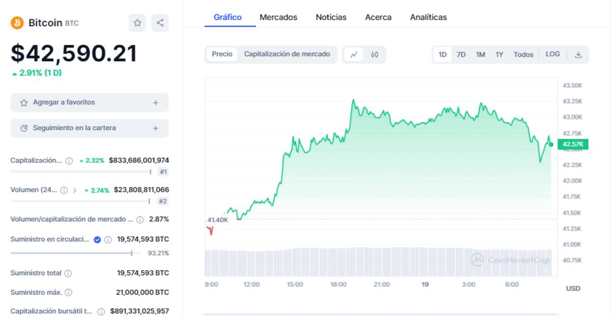 Por su parte, en CoinMarketCap, el precio de Bitcoin un incremento del 4,44% llegando hasta los $41,271 dólares por unidad, equivalentes a 496,504 pesos mexicanos.