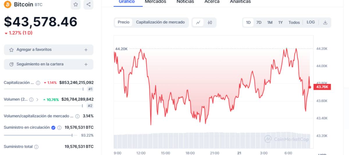 Por su parte, en CoinMarketCap, el precio de Bitcoin un incremento del 4,44% llegando hasta los $43,572 dólares por unidad, equivalentes a 743,220 pesos mexicanos.