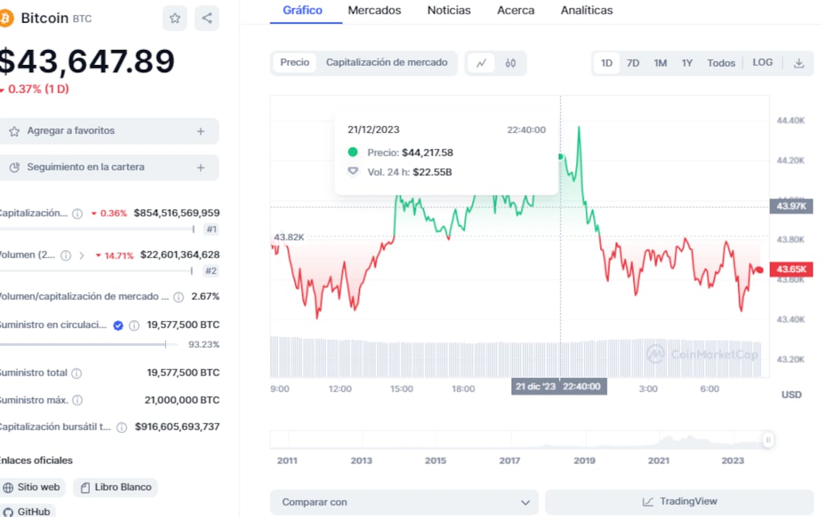 Por su parte, en CoinMarketCap, el precio de Bitcoin un incremento del 4,44% llegando hasta los $43,647 dólares por unidad, equivalentes a 743,220 pesos mexicanos.