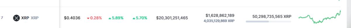 La criptomoneda XRP, por su parte, en las últimas 24 horas, ha manifestado un incremento del 5,89% estableciéndose en los 0,43 dólares por unidad, pero semanalmente manifestó un incremento del 5,70'%.
