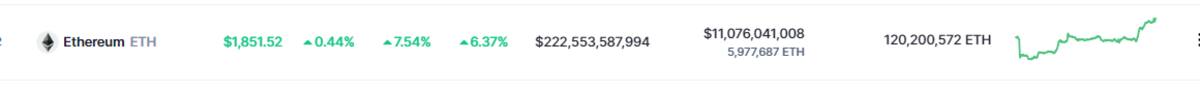 Ethereum, por su parte, manifestó en las últimas 24 horas, un ligero incremento del 7,53%% llegando a un precio de $1,852 dólares por cada unidad, equivalentes a 22 ,618 pesos mexicanos; pero, semanalmente, manifiesta un incremento del 2,42%