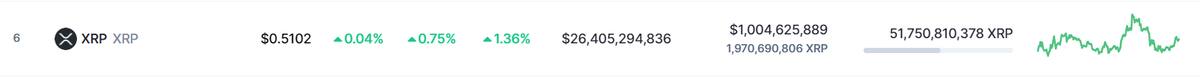 La criptomoneda XRP, por su parte, en las últimas 24 horas, ha manifestado un incremento del 3,78% estableciéndose en los 0,51 dólares por unidad, pero semanalmente manifestó una caída del 8,04%.