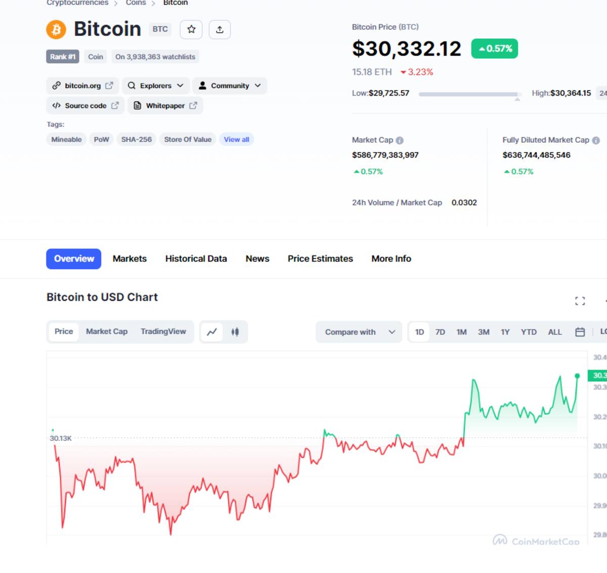 Por su parte, en CoinMarketCap, el precio de Bitcoin un incremento del 0,94% llegando hasta los $30,322 dólares por unidad, equivalentes a 523,482 pesos mexicanos.
