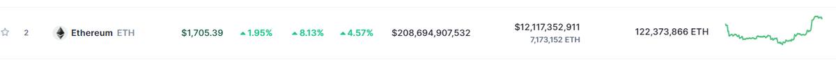 Ethereum, por su parte, manifestó en las últimas 24 horas, un incremento del 6,50% llegando a un precio de $1,705 dólares por cada unidad, equivalentes a 24,618 pesos mexicanos; pero, semanalmente, manifiesta un incremento del 4,57%.
