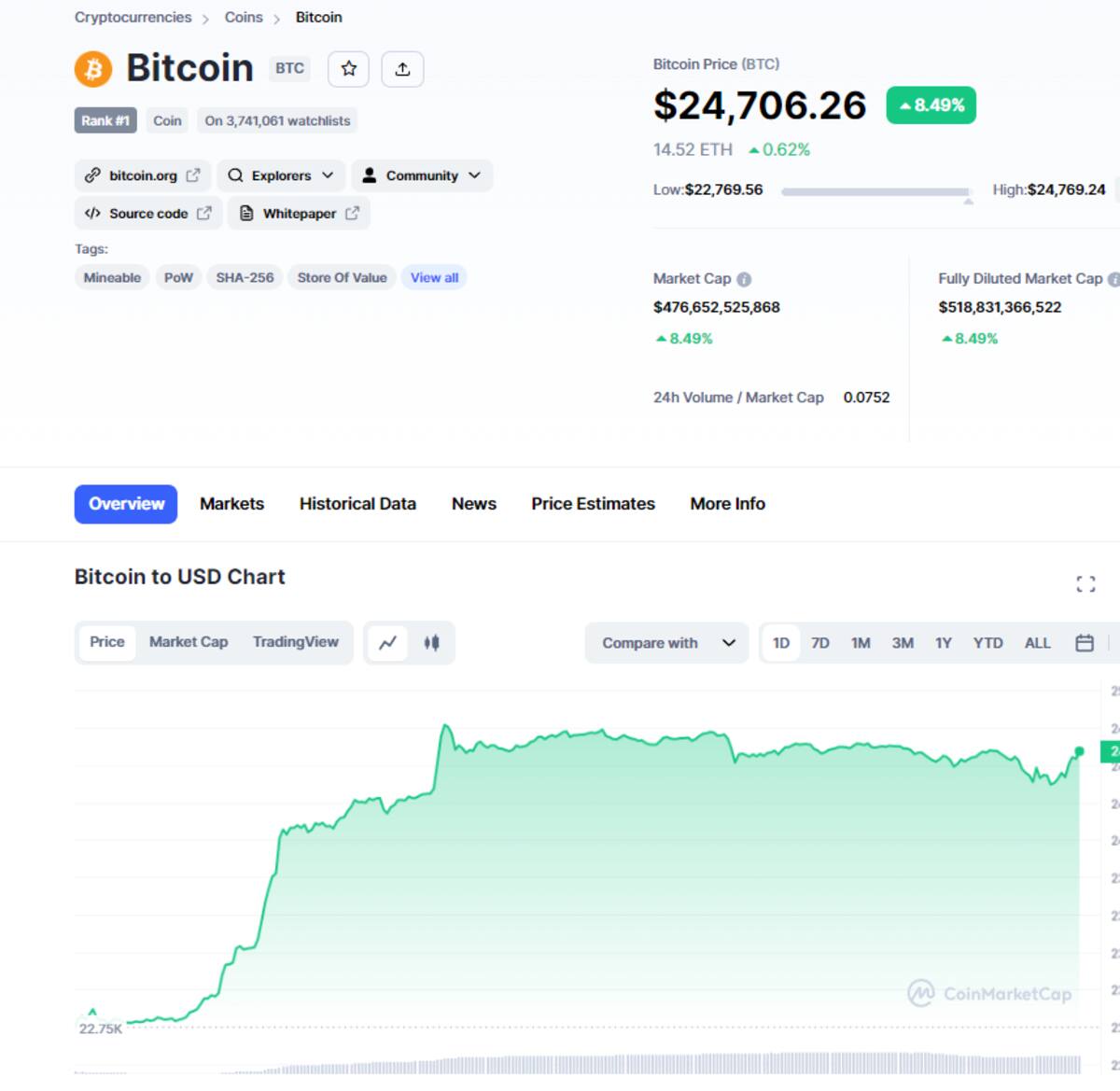 Por su parte, en CoinMarketCap, el precio de Bitcoin experimentó una caída del 4,25% llegando hasta los $24,706 dólares por unidad, equivalentes a 390,580 pesos mexicanos.