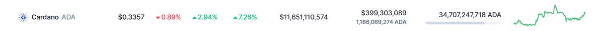 El precio de Cardano (ADA), por su parte, manifestó en las últimas 24 horas, un incremento del 13,50%, por lo que llegó a un valor de $0.334 ólares; sin embargo, en los últimos 7 días, manifestó un incremento del 2,54%