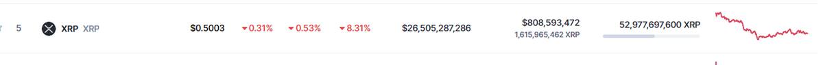 La criptomoneda XRP, por su parte, en las últimas 24 horas, ha manifestado una caída del 2,89% estableciéndose en los 0,51 dólares por unidad, pero semanalmente manifestó una caída del 8,29%.