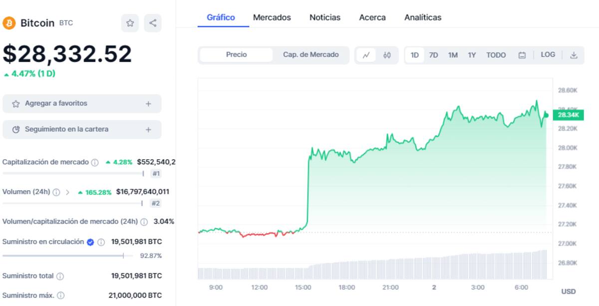 Por su parte, en CoinMarketCap, el precio de Bitcoin un incremento del 0,72% llegando hasta los $28,328 dólares por unidad, equivalentes a 496,504 pesos mexicanos.