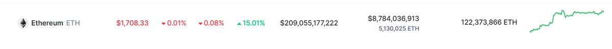 Ethereum, por su parte, manifestó en las últimas 24 horas, un incremento del 6,50% llegando a un precio de $1,705 dólares por cada unidad, equivalentes a 24,618 pesos mexicanos; pero, semanalmente, manifiesta un incremento del 15,01%.