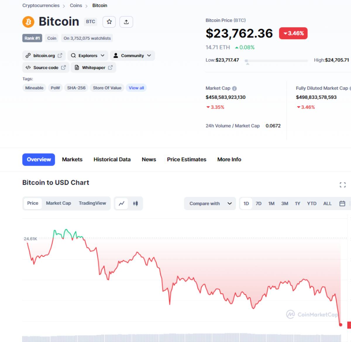 Por su parte, en CoinMarketCap, el precio de Bitcoin experimentó una caída del 4,25% llegando hasta los $24,706 dólares por unidad, equivalentes a 390,580 pesos mexicanos.