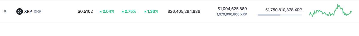 La criptomoneda XRP, por su parte, en las últimas 24 horas, ha manifestado un incremento del 3,78% estableciéndose en los 0,51 dólares por unidad, pero semanalmente manifestó una caída del 8,04%.