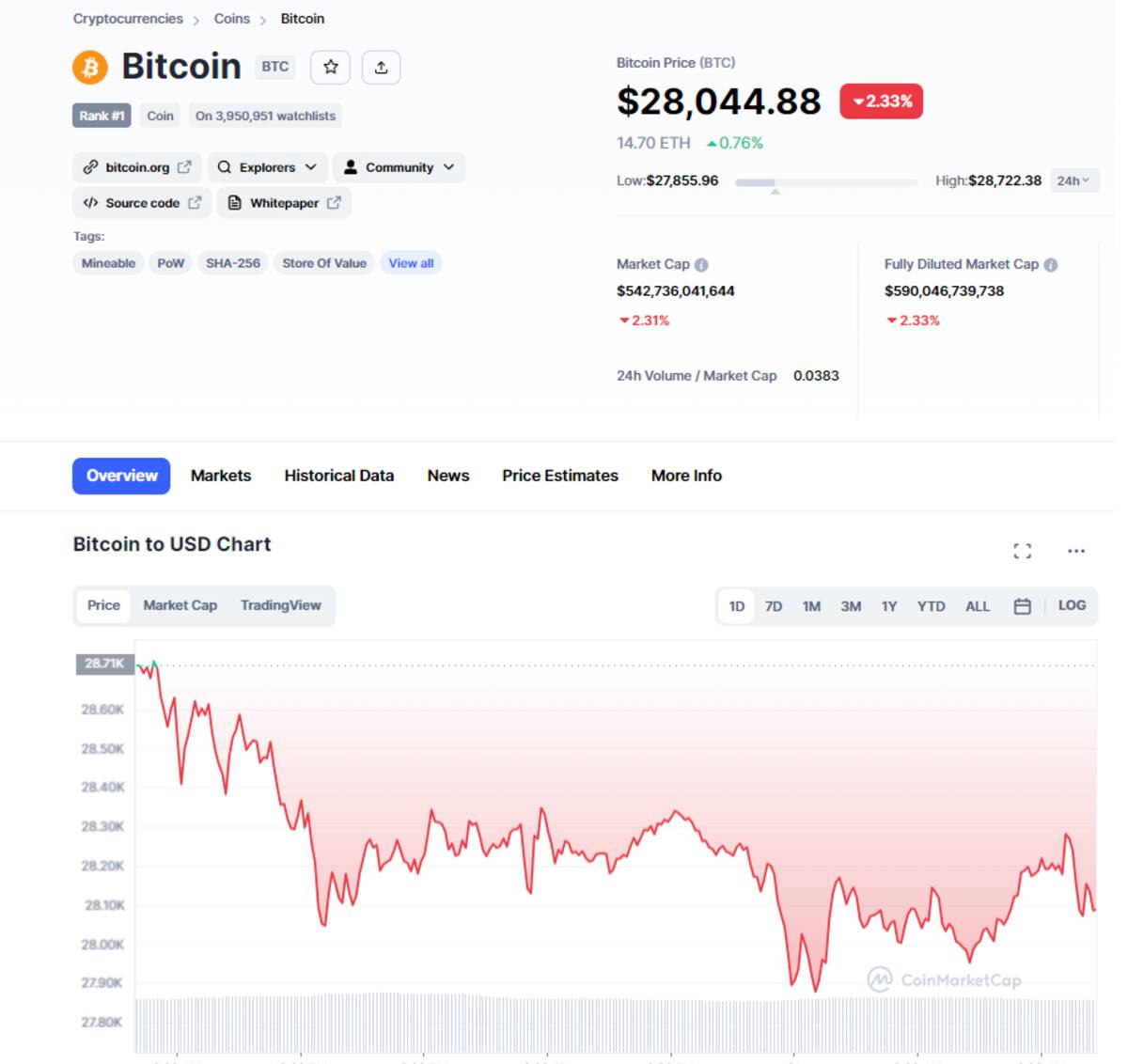 Por su parte, en CoinMarketCap, el precio de Bitcoin una caída del 3,00% llegando hasta los $28,044 dólares por unidad, equivalentes a 523,482 pesos mexicanos.