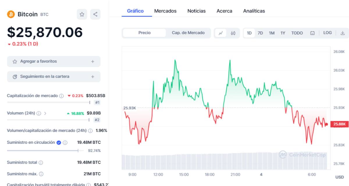 Por su parte, en CoinMarketCap, el precio de Bitcoin una caída del 4,35% llegando hasta los $25,870 dólares por unidad, equivalentes a 444,513 pesos mexicanos.