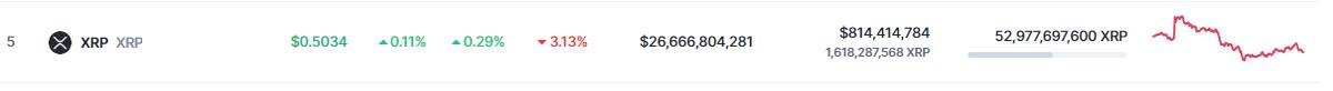 La criptomoneda XRP, por su parte, en las últimas 24 horas, ha manifestado una caída del 2,89% estableciéndose en los 0,51 dólares por unidad, pero semanalmente manifestó una caída del 2,84%