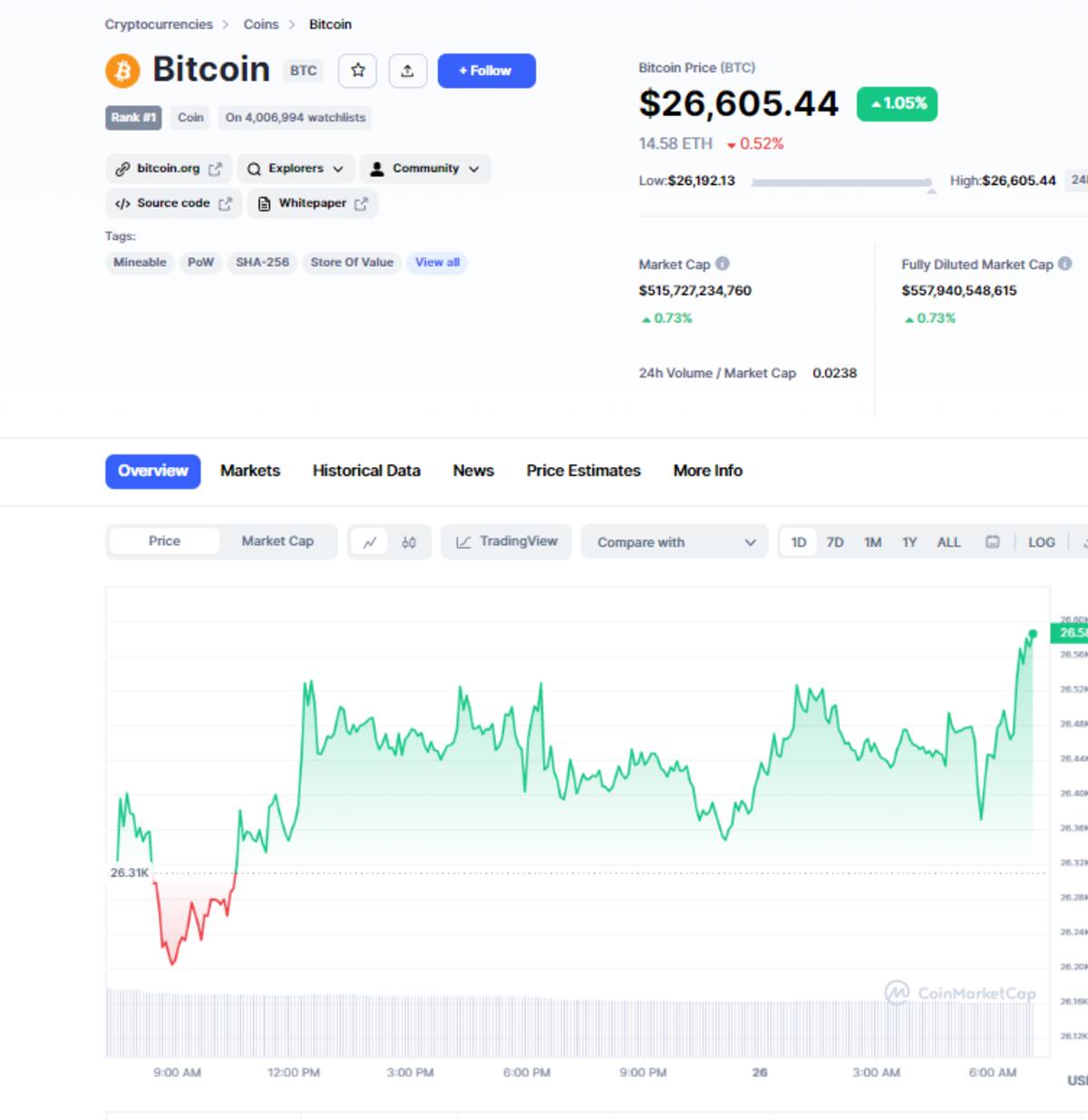 Por su parte, en CoinMarketCap, el precio de Bitcoin una caída del 2,74% llegando hasta los $26,446 dólares por unidad, equivalentes a 466.0600 pesos mexicanos.