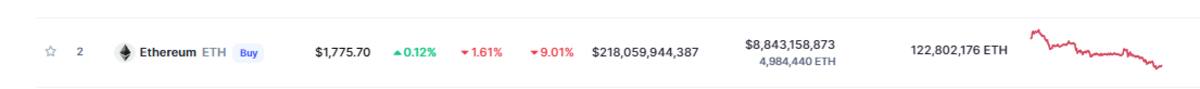 Ethereum, por su parte, manifestó en las últimas 24 horas, un ligero incremento del 4,23% llegando a un precio de $1775 dólares por cada unidad, equivalentes a 22 ,618 pesos mexicanos; pero, semanalmente, manifiesta un incremento del 2,42%