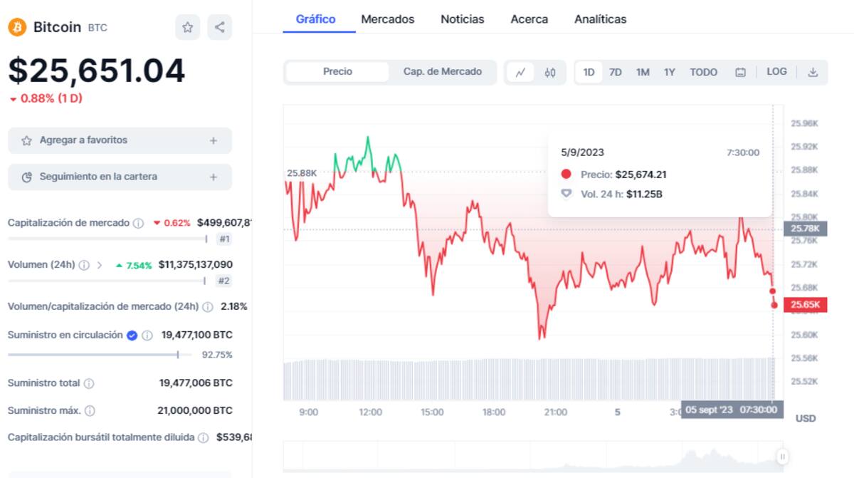 Por su parte, en CoinMarketCap, el precio de Bitcoin una caída del 4,35% llegando hasta los $$25,651 dólares por unidad, equivalentes a 444,513 pesos mexicanos.