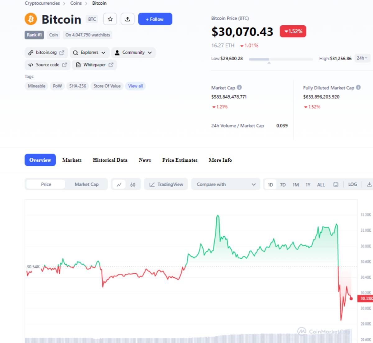 Por su parte, en CoinMarketCap, el precio de Bitcoin una caída del 1,51% llegando hasta los $29,928 dólares por unidad, equivalentes a 513,948 pesos mexicanos.