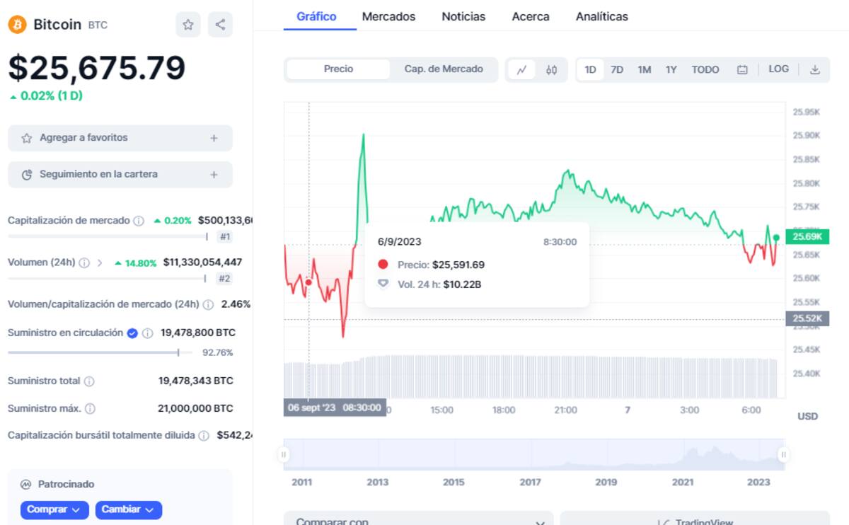 Por su parte, en CoinMarketCap, el precio de Bitcoin una caída del 4,35% llegando hasta los $25,675 dólares por unidad, equivalentes a 450,383 pesos mexicanos.