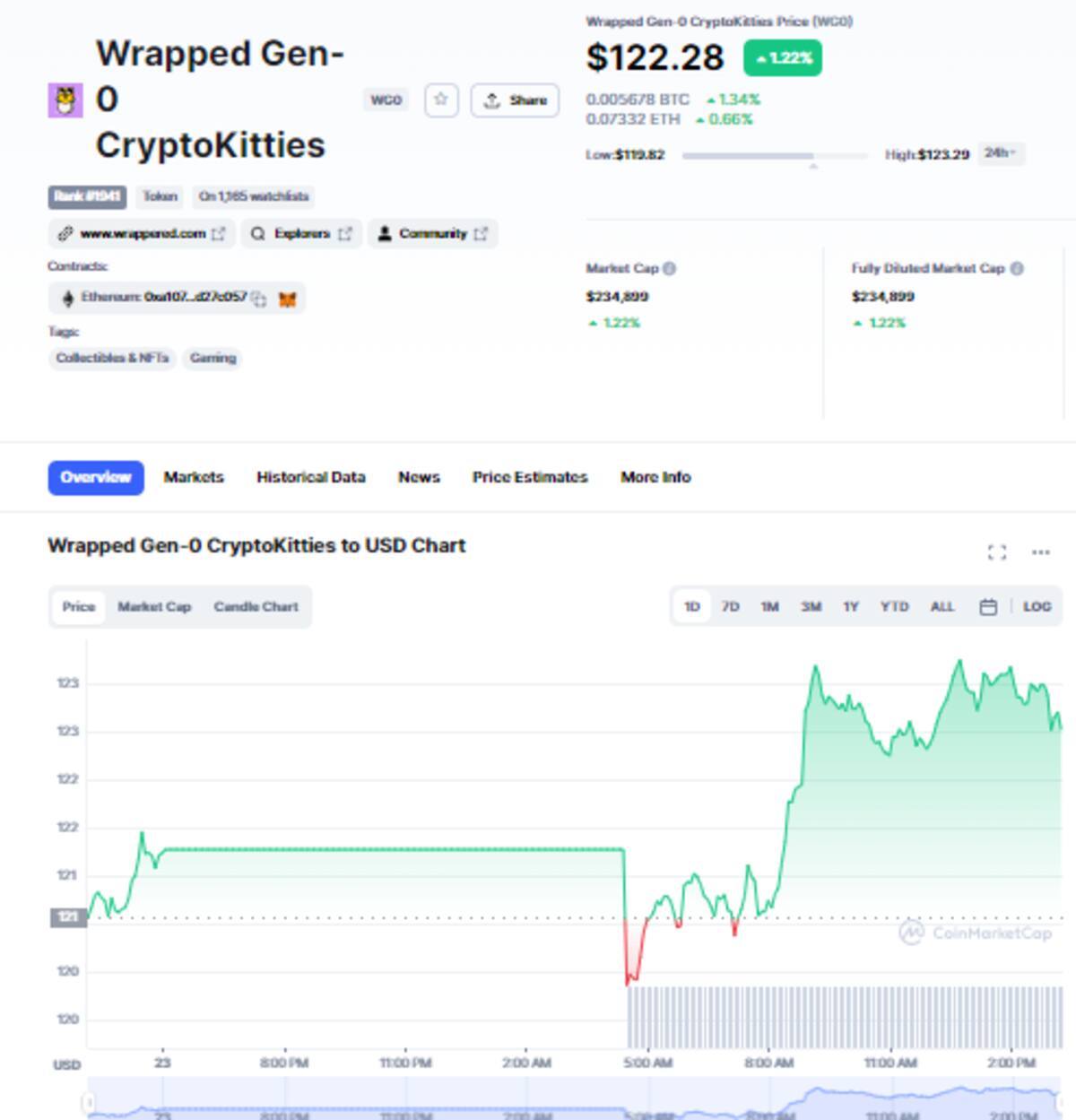 Actualmente, el mercado, cuyo token es Wrapped Gen-0 CryptoKitties se valorizo en $122 dólares, un incremento de 1,67% en las últimas 24 horas.