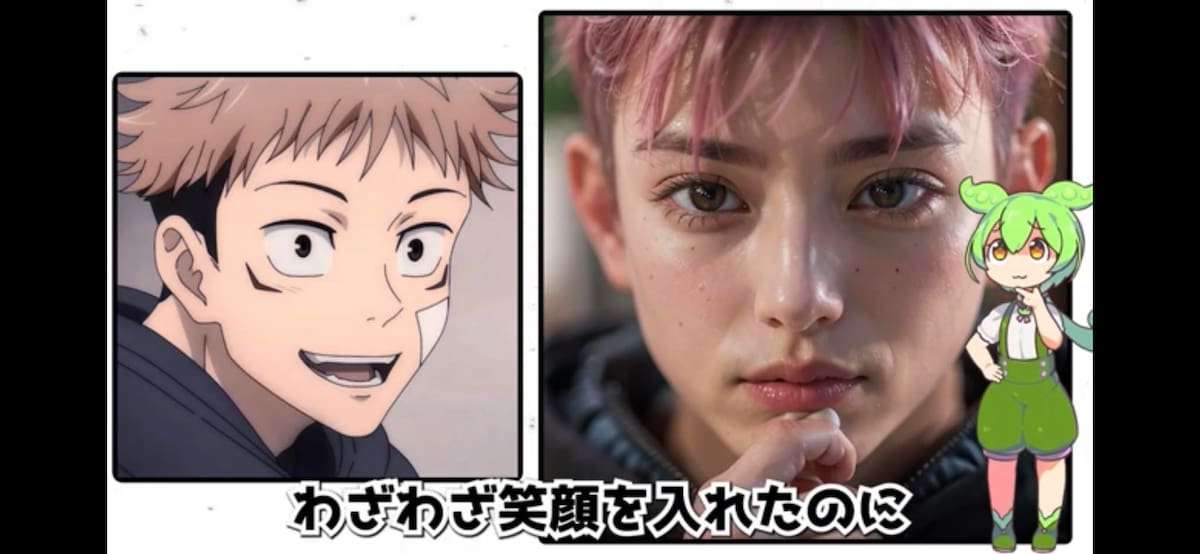 Para crear las imágenes de Yuji Itadori, ZendaAI utilizó una fotografía del personaje como referencia para generar otra de su versión realista con rasgos similares como el color de pelo, el tono de piel, la forma de los ojos, etc. Además, aplicó diferentes filtros y efectos para recrear las marcas faciales de Sukuna, las cicatrices, las emociones y las poses.