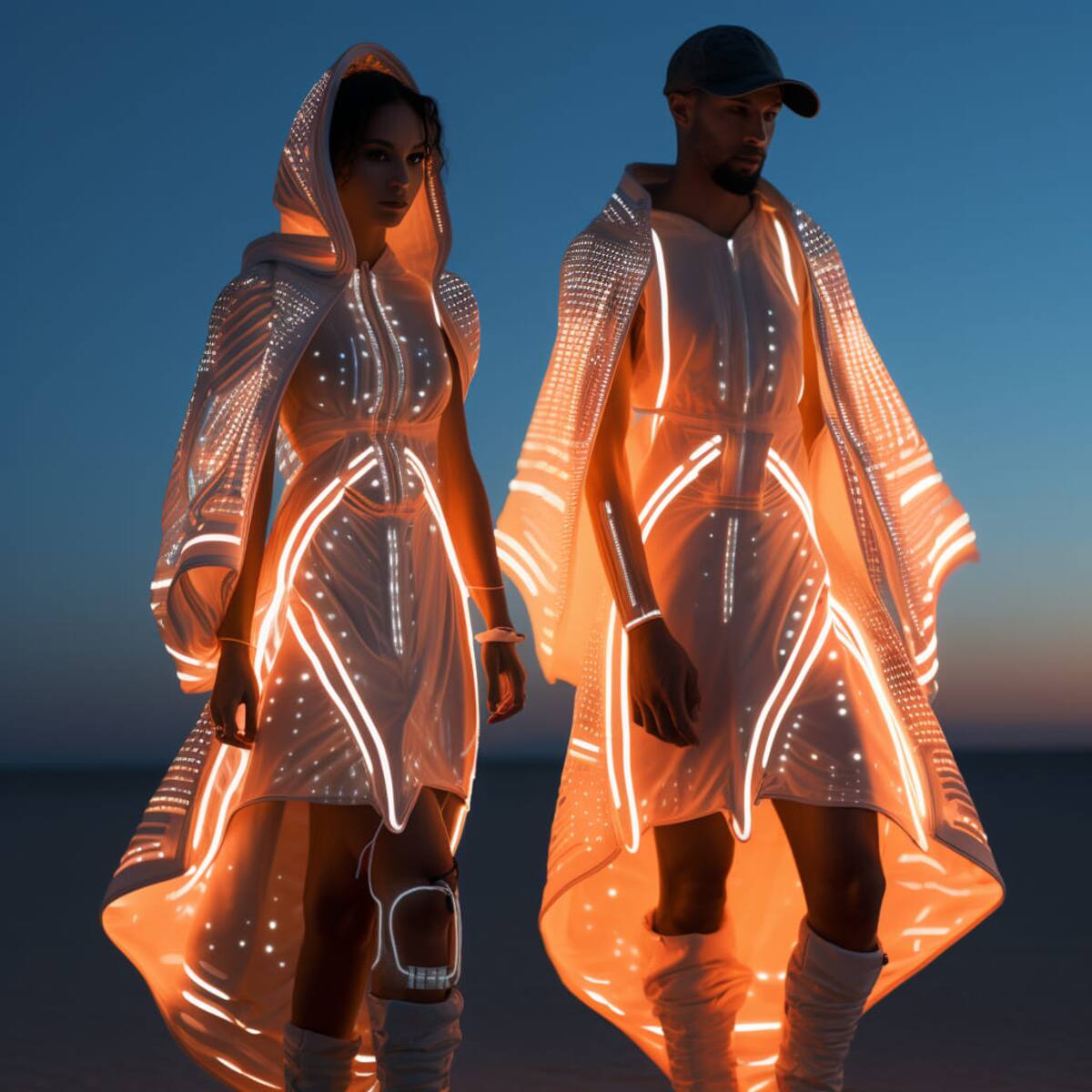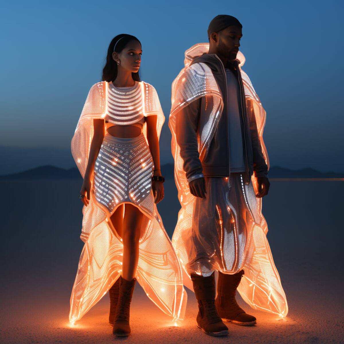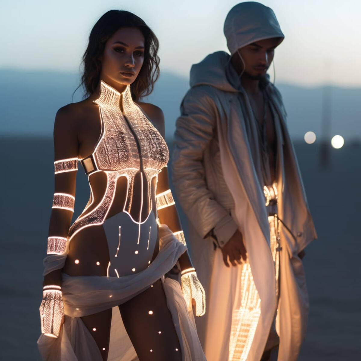 Tal como se observa en las ilustraciones, y como señala la IA de Bing, las imágenes brillan puesto que los vestidos parecen tener luces led y en tonos transparentes; el estilo, que parece ser retrofuturista, también muestra cómo el ser humano haría una simbiosis con elementos naturales y reciclables.