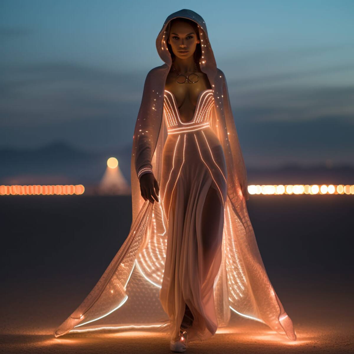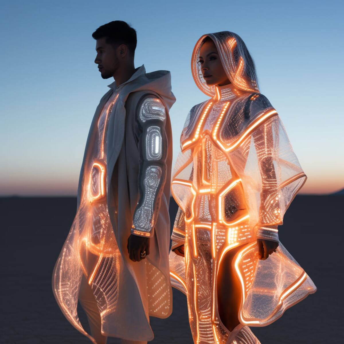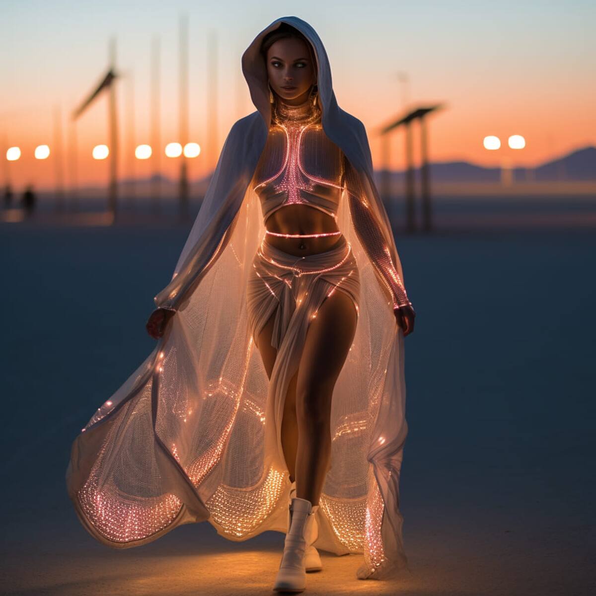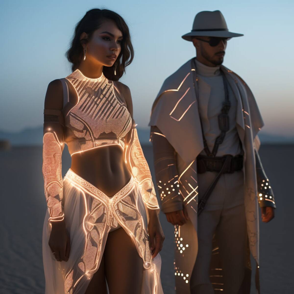 Tal como se observa en las ilustraciones, y como señala la IA de Bing, las imágenes brillan puesto que los vestidos parecen tener luces led y en tonos transparentes; el estilo, que parece ser retrofuturista, también muestra cómo el ser humano haría una simbiosis con elementos naturales y reciclables.