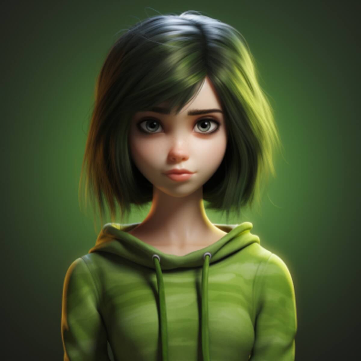 Para generar la imagen, le hemos pedido a Midjourney que dibuje a Desagrado como una niña en la vida real. El resultado es sorprendente: una niña con el pelo verde y corto, los ojos verdes y una expresión de disgusto en su rostro.