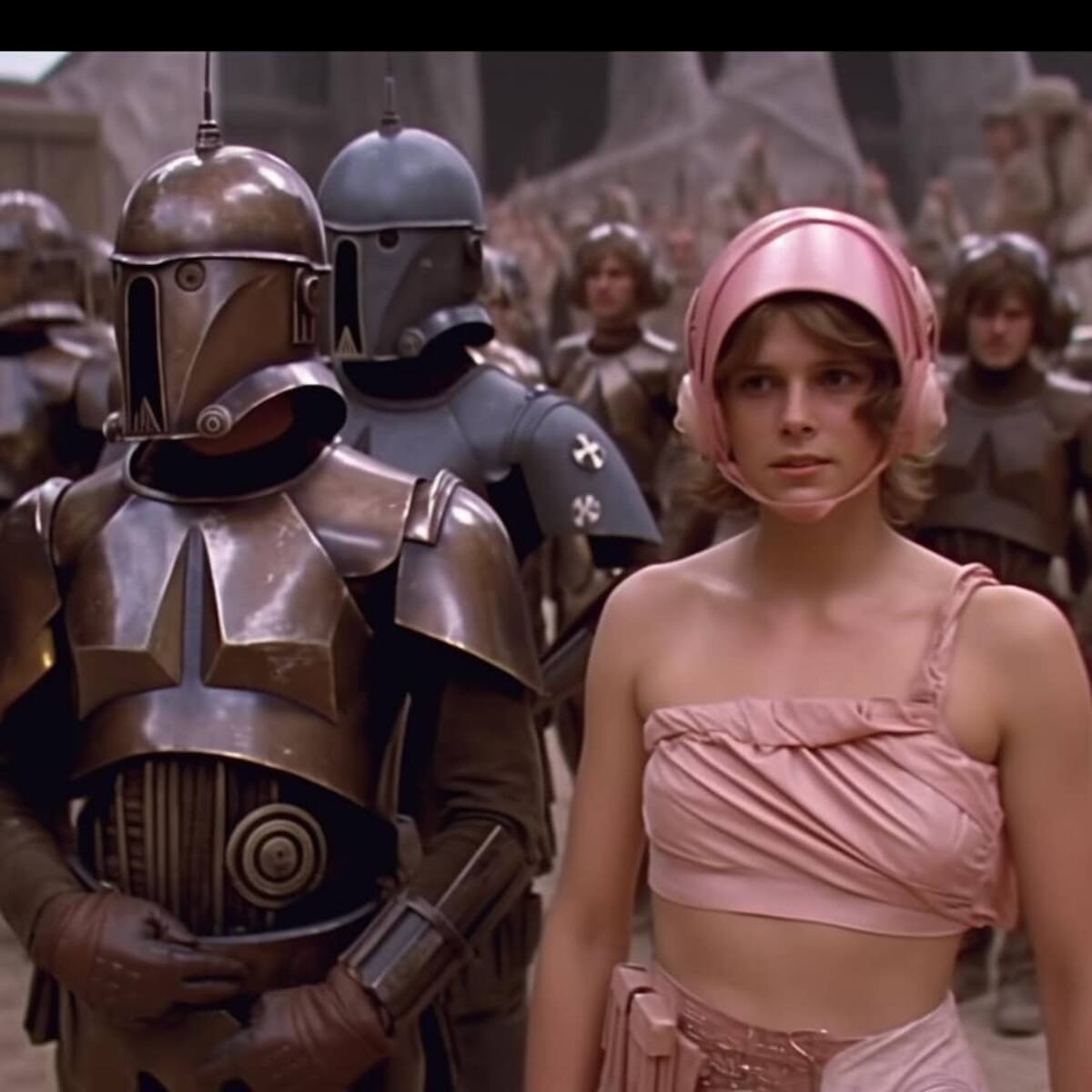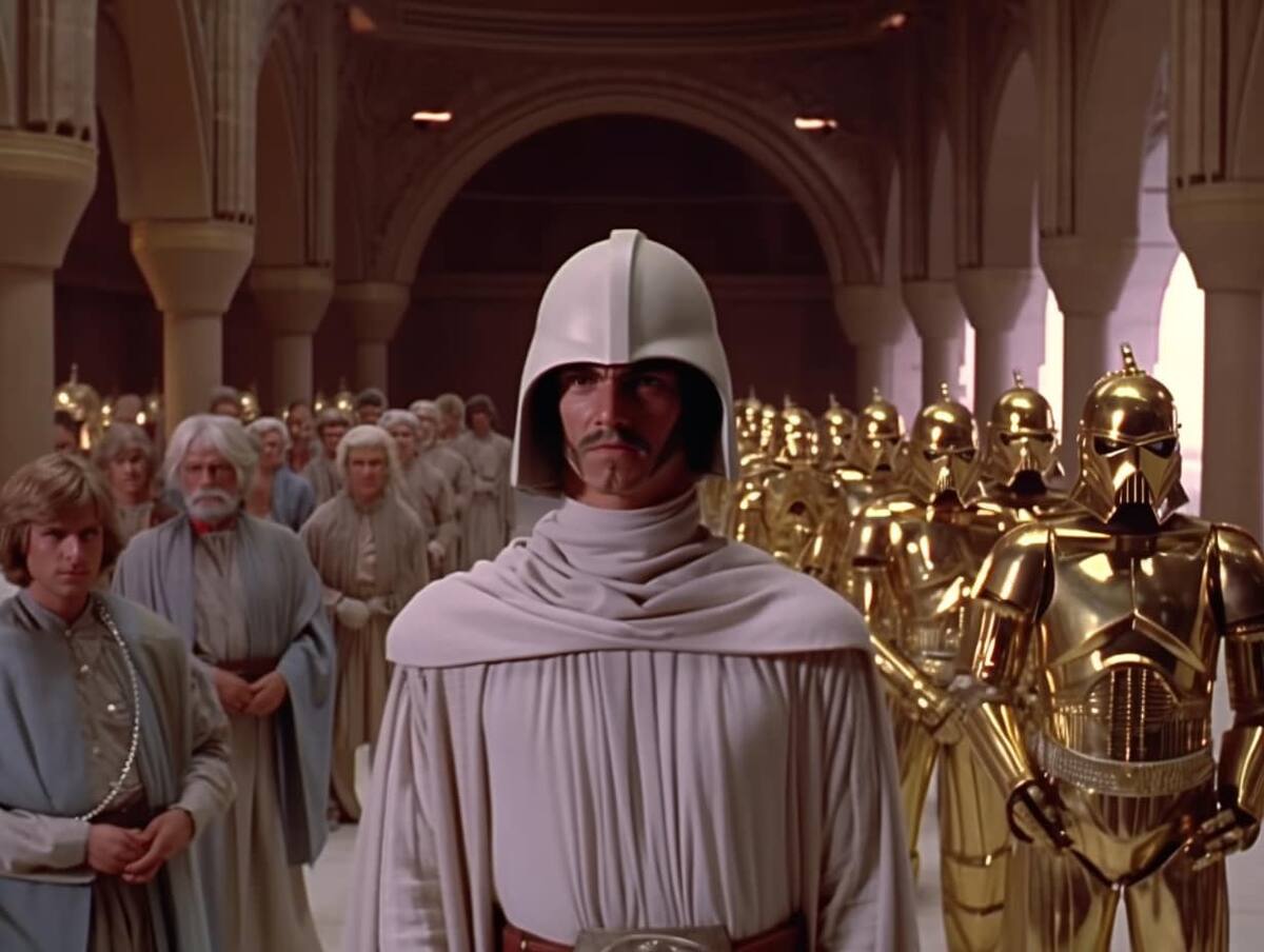 Hall usó una herramienta llamada Midjourney, que le permite generar gráficos a partir de textos escritos. Así, pudo imaginar cómo serían los personajes, las naves y los escenarios de la saga galáctica en un contexto histórico diferente.