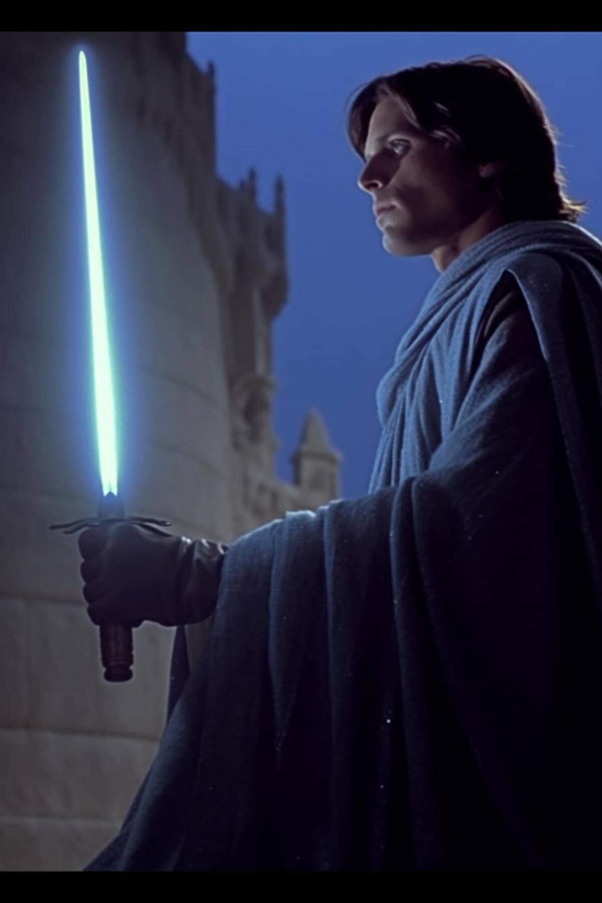 En una de las ilustraciones se observa al caballero Jedi que, se presupone, se trata de Luke Skywalker, quien se encuentra de pie frente a un castillo y con su sable de luz.
