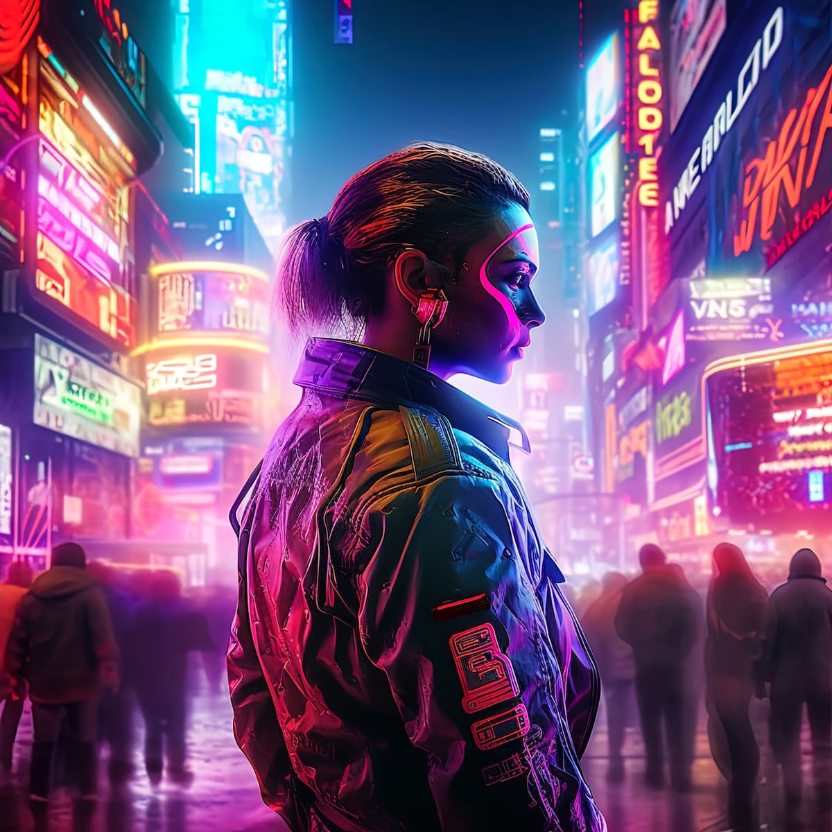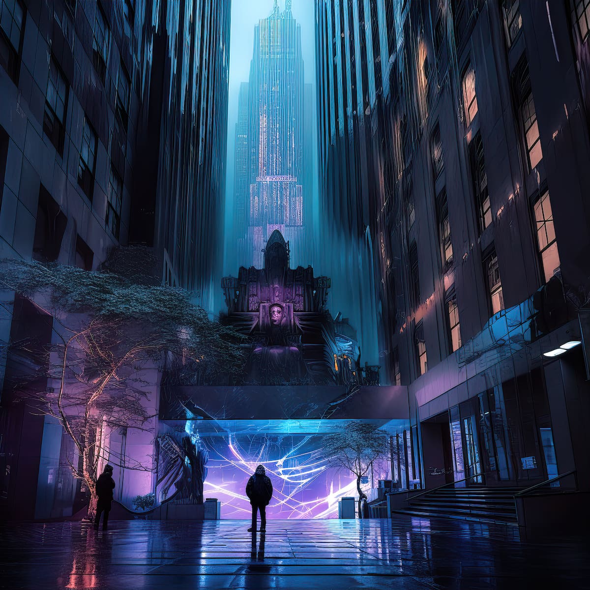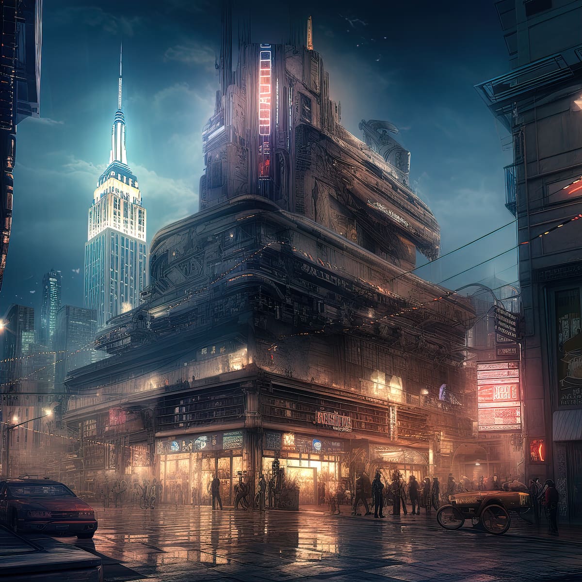 Gabriele Falco escribió varias descripciones de cómo imaginaba Nueva York en estilo cyberpunk, y las introdujo en Midjourney para obtener las imágenes correspondientes. El resultado es sorprendente: vemos una ciudad llena de rascacielos iluminados por neones, cables, antenas y pantallas gigantes; una ciudad donde la contaminación, el caos y la violencia son el pan de cada día; una ciudad donde la naturaleza ha sido relegada a un segundo plano y donde los humanos se mezclan con androides, implantes cibernéticos y hackers.