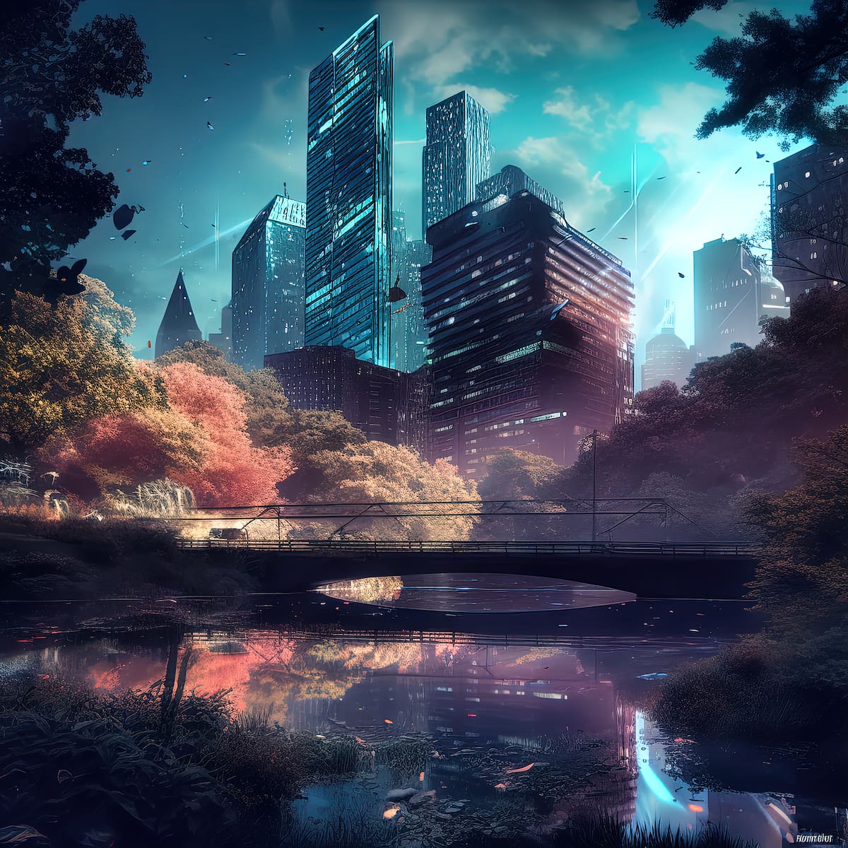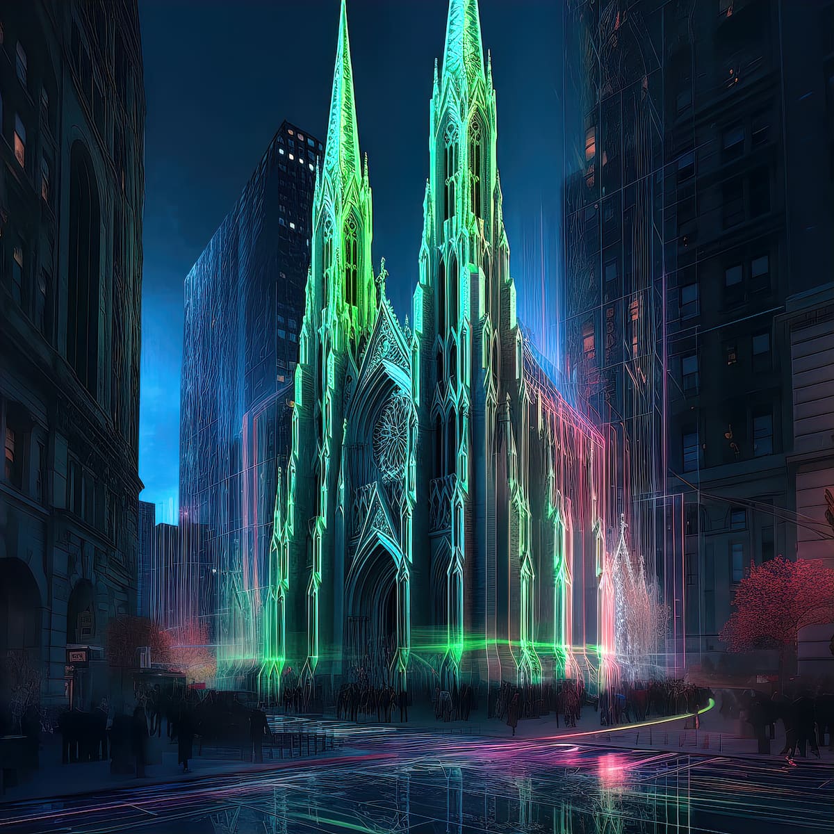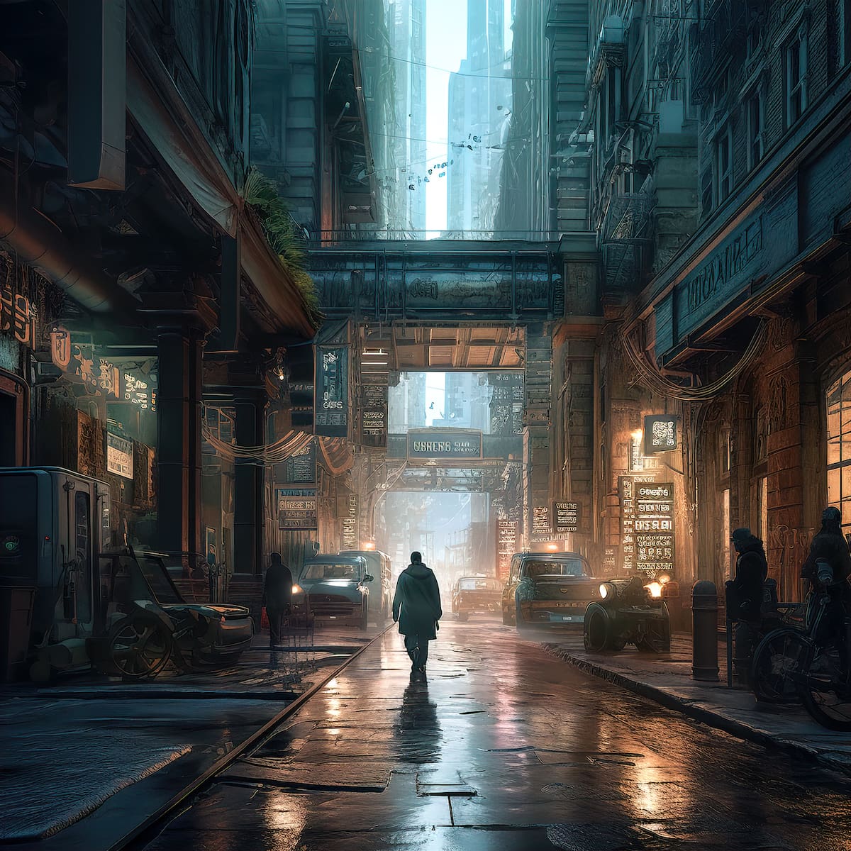 Gabriele Falco escribió varias descripciones de cómo imaginaba Nueva York en estilo cyberpunk, y las introdujo en Midjourney para obtener las imágenes correspondientes. El resultado es sorprendente: vemos una ciudad llena de rascacielos iluminados por neones, cables, antenas y pantallas gigantes; una ciudad donde la contaminación, el caos y la violencia son el pan de cada día; una ciudad donde la naturaleza ha sido relegada a un segundo plano y donde los humanos se mezclan con androides, implantes cibernéticos y hackers.