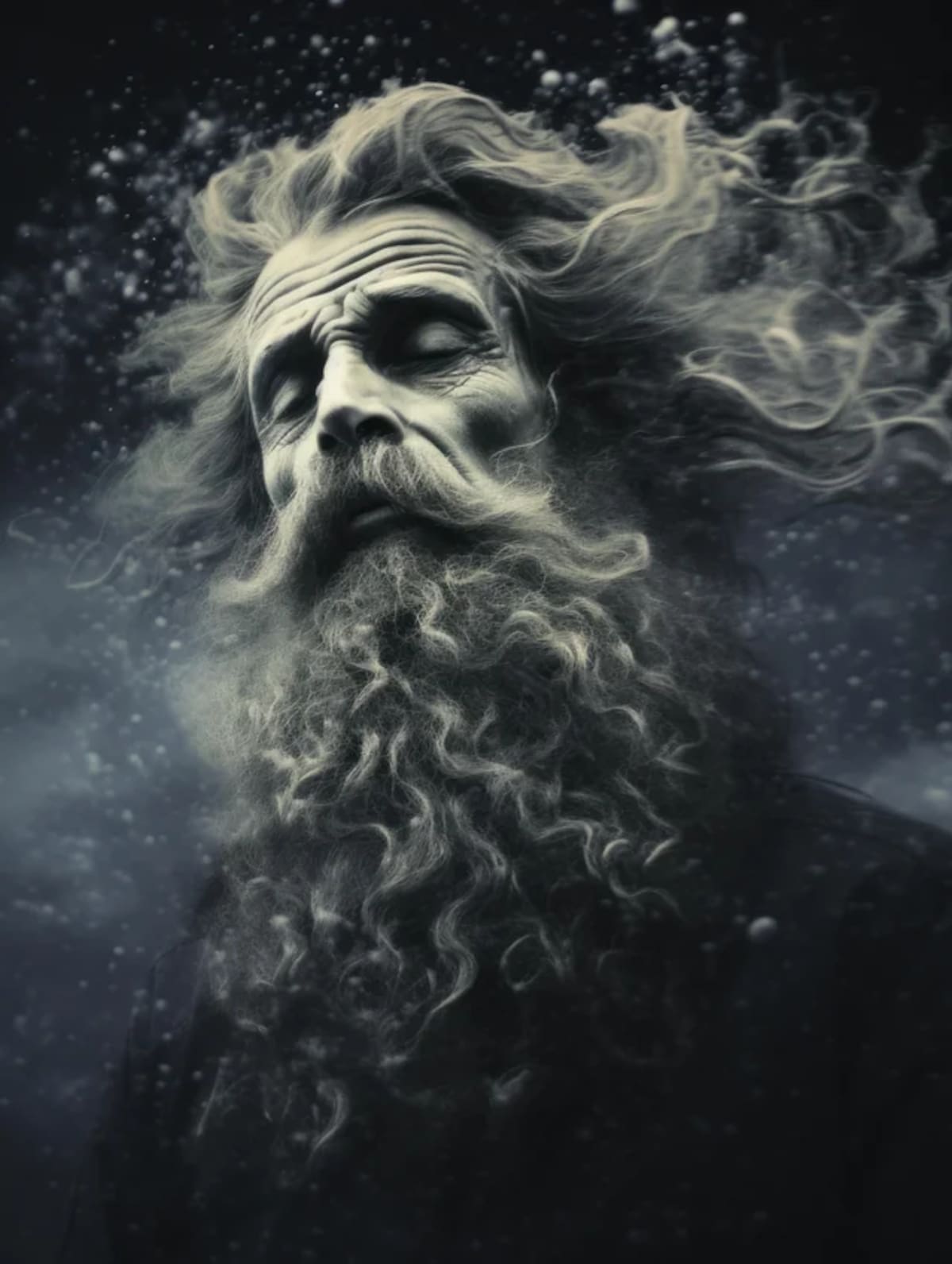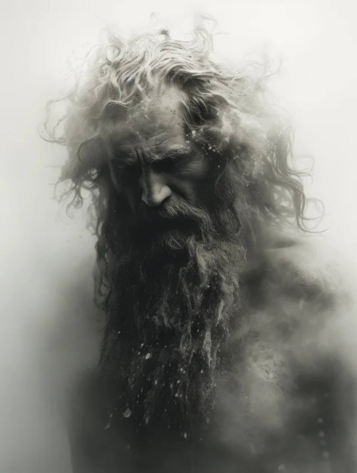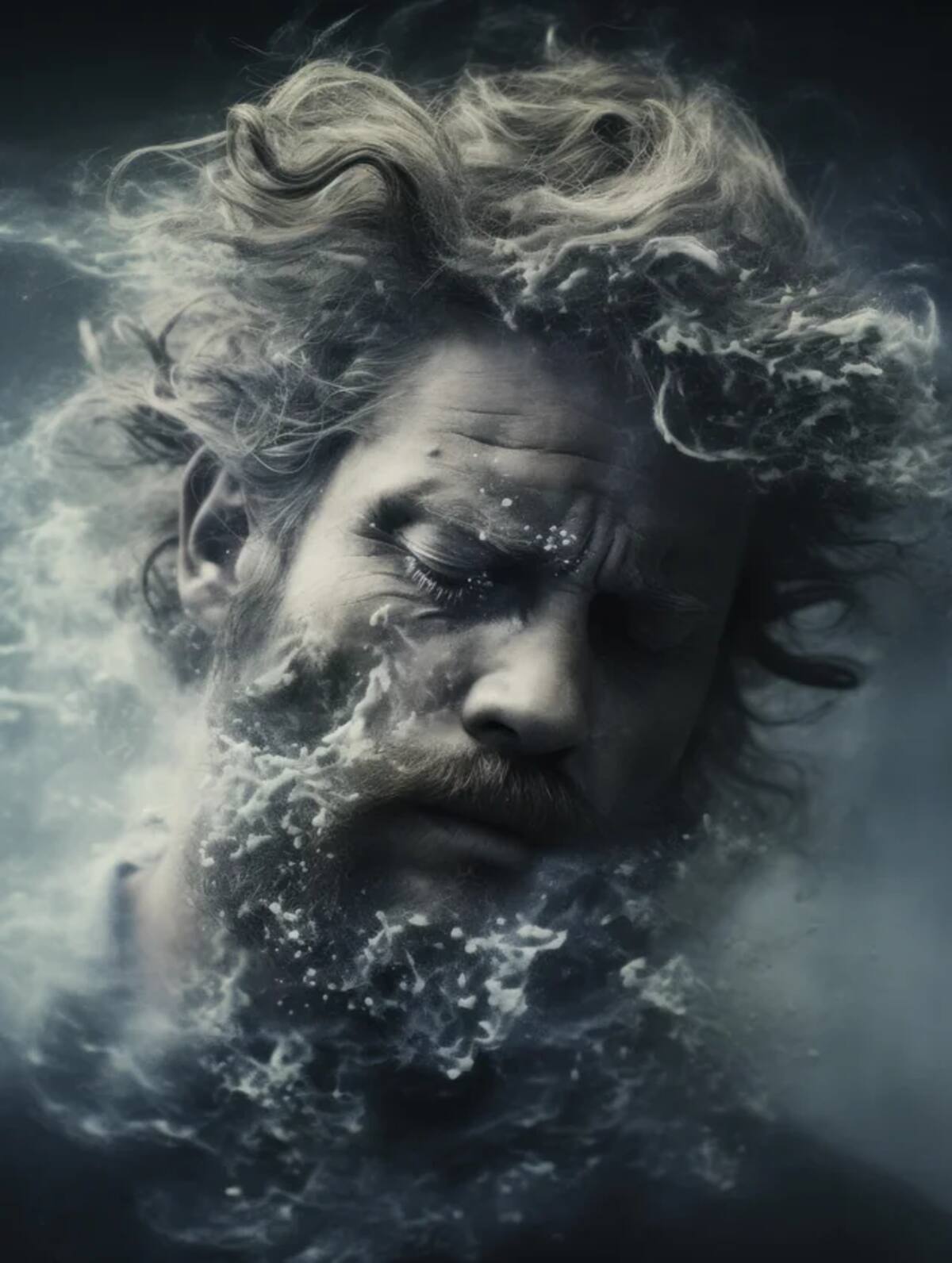 En las imágenes podemos ver retratos híperrealistas de Poseidón como un hombre barbudo de semblante serio, tez que le hace lucir como una estatua y con un fondo propio de una tormenta marina infestada de niebla.