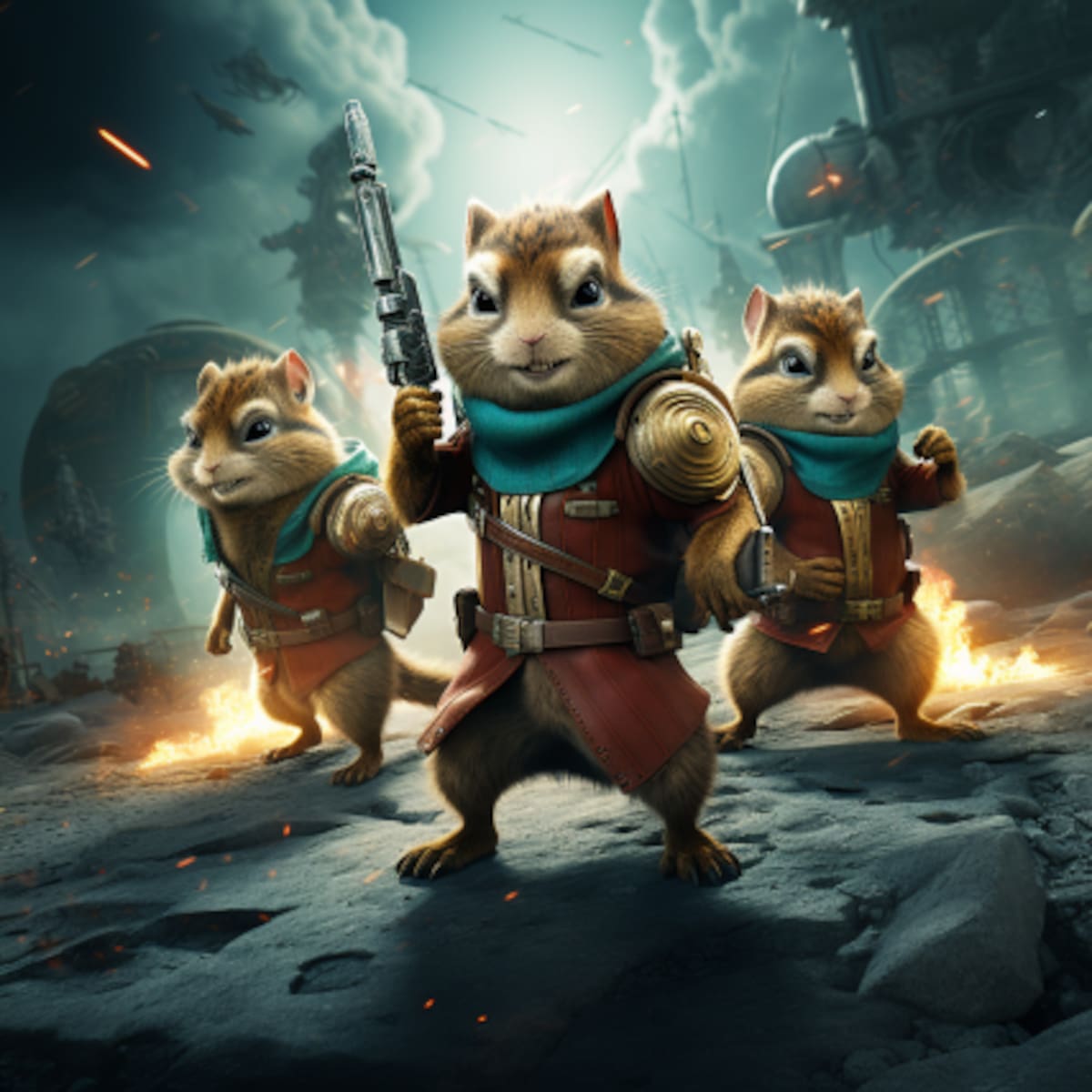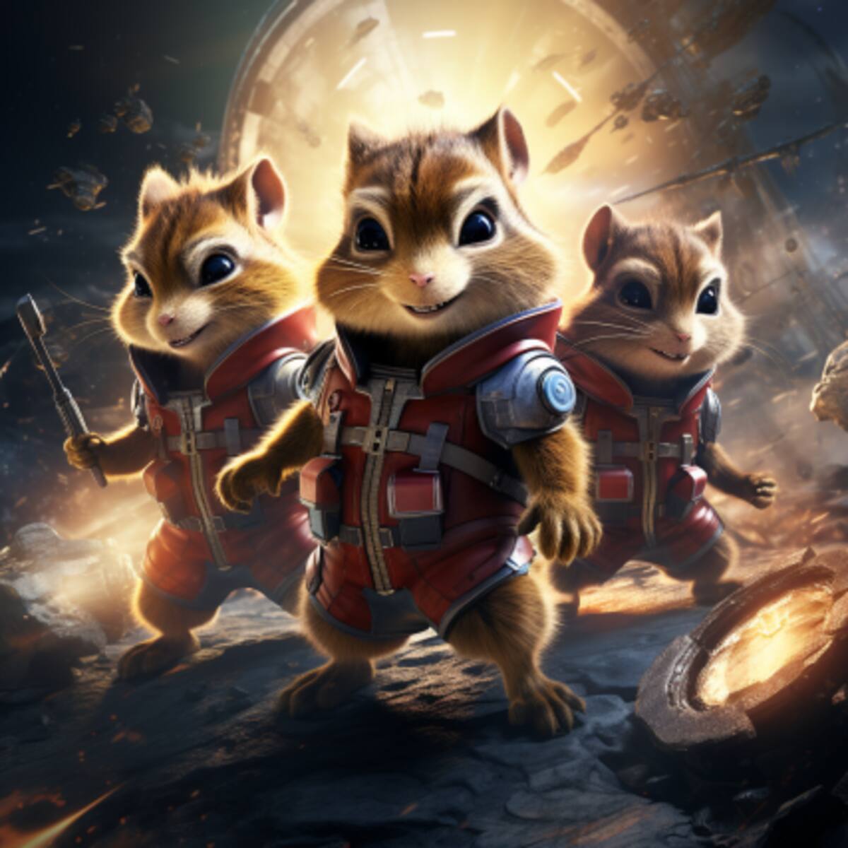 Utilizamos Midjourney para generar una imagen de Alvin y las ardillas como piratas espaciales. El resultado es sorprendente y divertido. Se puede ver a Alvin, Simon y Theodore vestidos con trajes espaciales, armados con pistolas láser y rodeados de planetas y estrellas. Los tres tienen una expresión de confianza y desafío, como si estuvieran listos para enfrentarse a cualquier peligro.