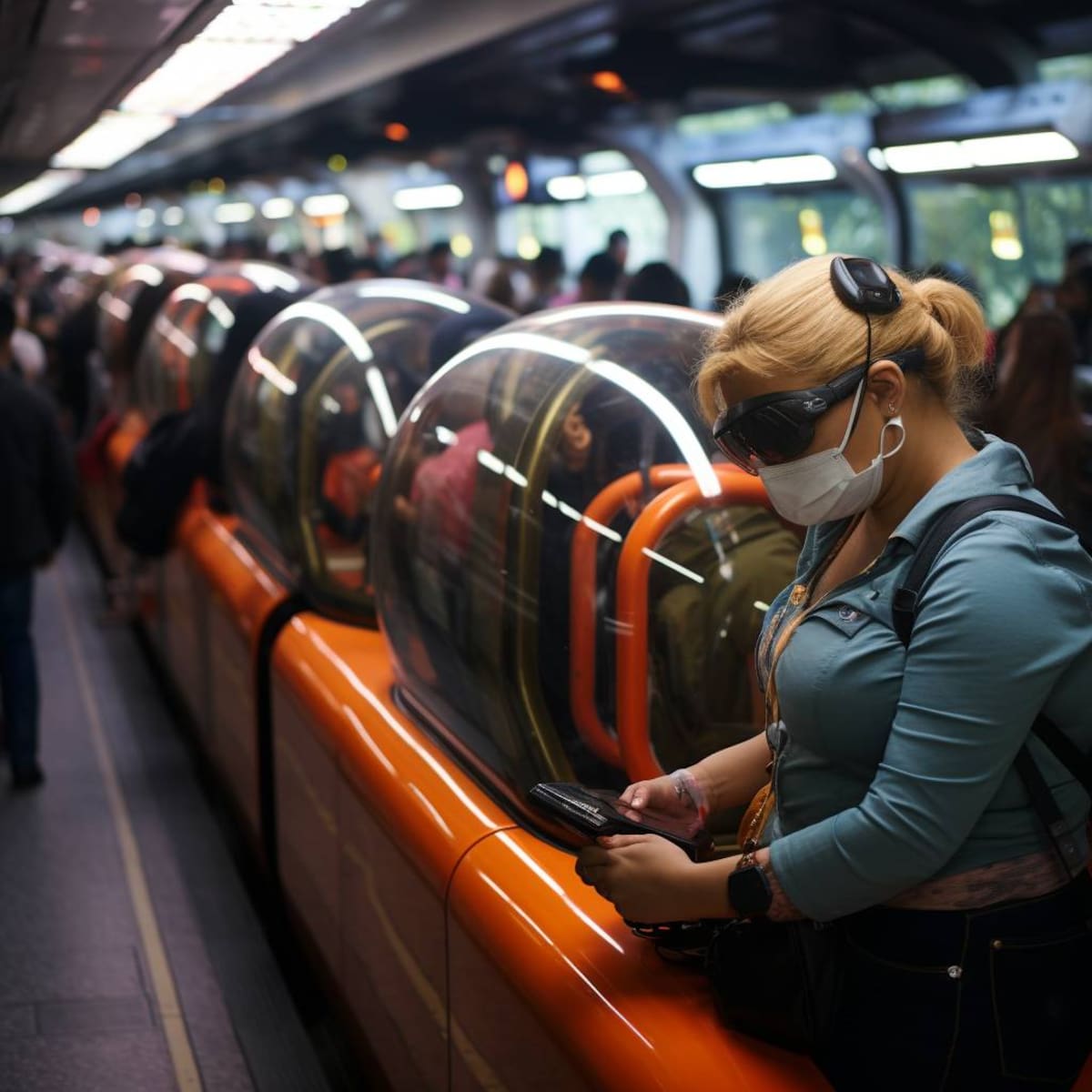 — En el futuro, el metro de la CDMX lucirá como una red de tubos metálicos que cruzan el cielo, transportando elegantes trenes que funcionan con energía solar y levitación magnética, las estaciones serían centros de actividad, con carteles de neón, hologramas y pantallas de realidad aumentada que anuncian diversos productos y servicios, los pasajeros serían una mezcla diversa de humanos, cíborgs y androides, cada uno con su propio estilo e identidad, algunos llevarían implantes, tatuajes o piercings que mejoran sus sentidos o habilidades, otros llevarían artilugios, armas o drones que les ayudan a navegar por la jungla urbana, el metro sería un símbolo tanto de progreso como de desigualdad, ya que conecta a los ricos y poderosos con los pobres y marginados.