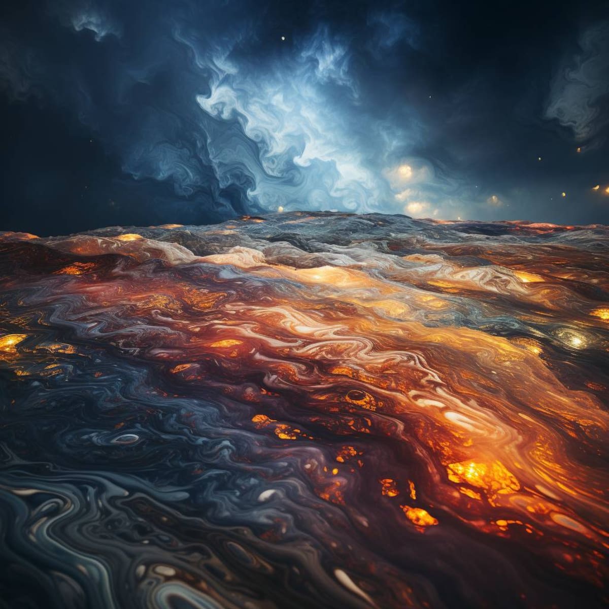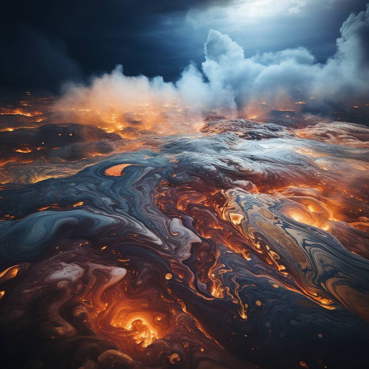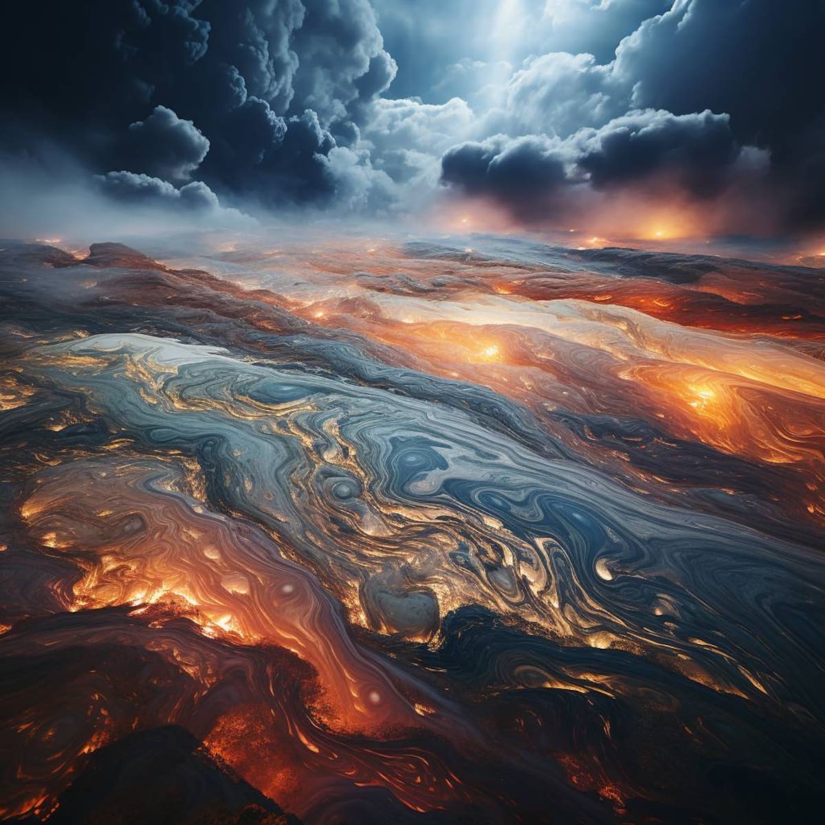 Por medio de datos científicos veraces acerca de las condiciones atmosféricas de Júpiter, decidimos utilizar el bot generador de imágenes de Midjourney para tratar de colocarnos desde el punto de vista de una cámara que desciende hasta la base más sólida del planeta, conocido por sus violentos y feroces tormentas y huracanes.