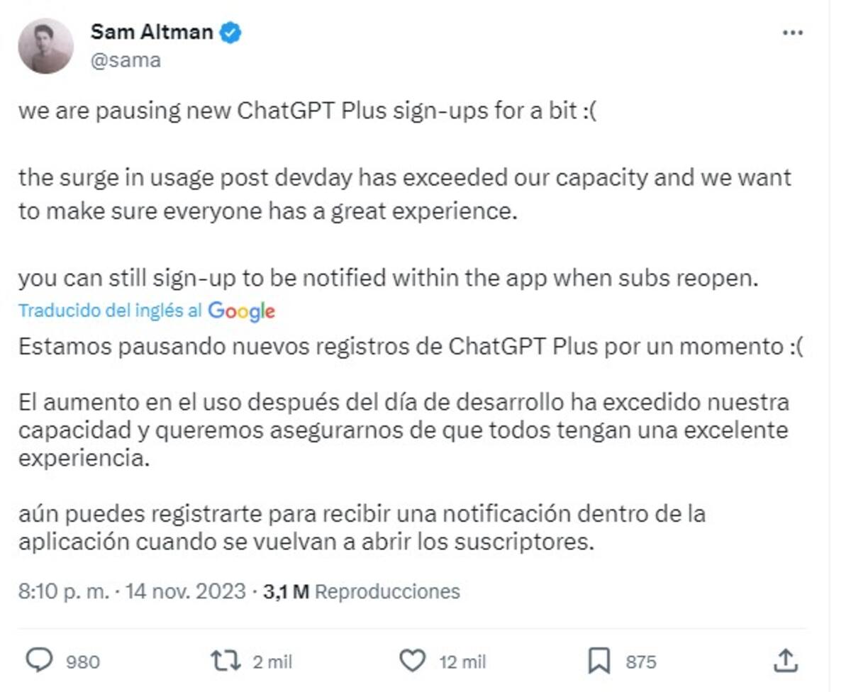 Altman informó a través de Twitter que están pausando temporalmente las nuevas inscripciones para ChatGPT Plus. La alta demanda posterior al DevDay ha excedido la capacidad de OpenAI, y la pausa busca asegurar una experiencia óptima para todos los usuarios.