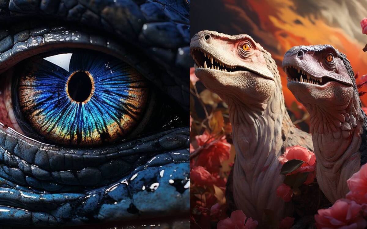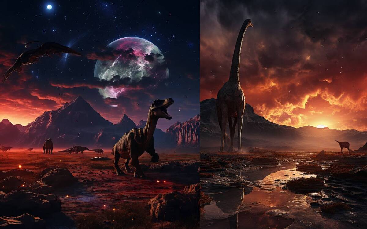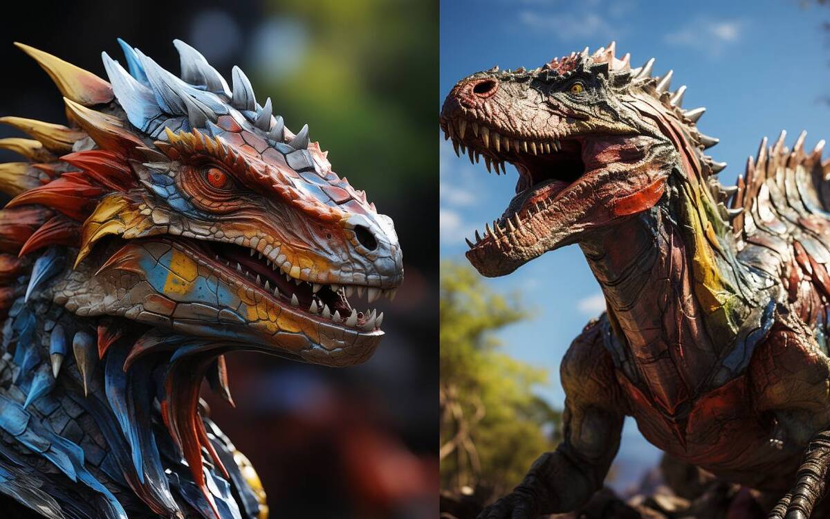 Utilizando el bot de ChatGPT, tratamos de imaginar cómo se verían los dinosaurios de otros planetas, tomando en consideración factores físicos y biológicos. Con las descripciones dadas, construimos las siguientes imágenes en el bot de Midjourney con resultados que si bien guardan semejanza con la idea que tenemos de los dinosaurios terrestres, presentan suficientes elementos para señalar que se tratan de especies que sólo habitan en la imaginación del público.