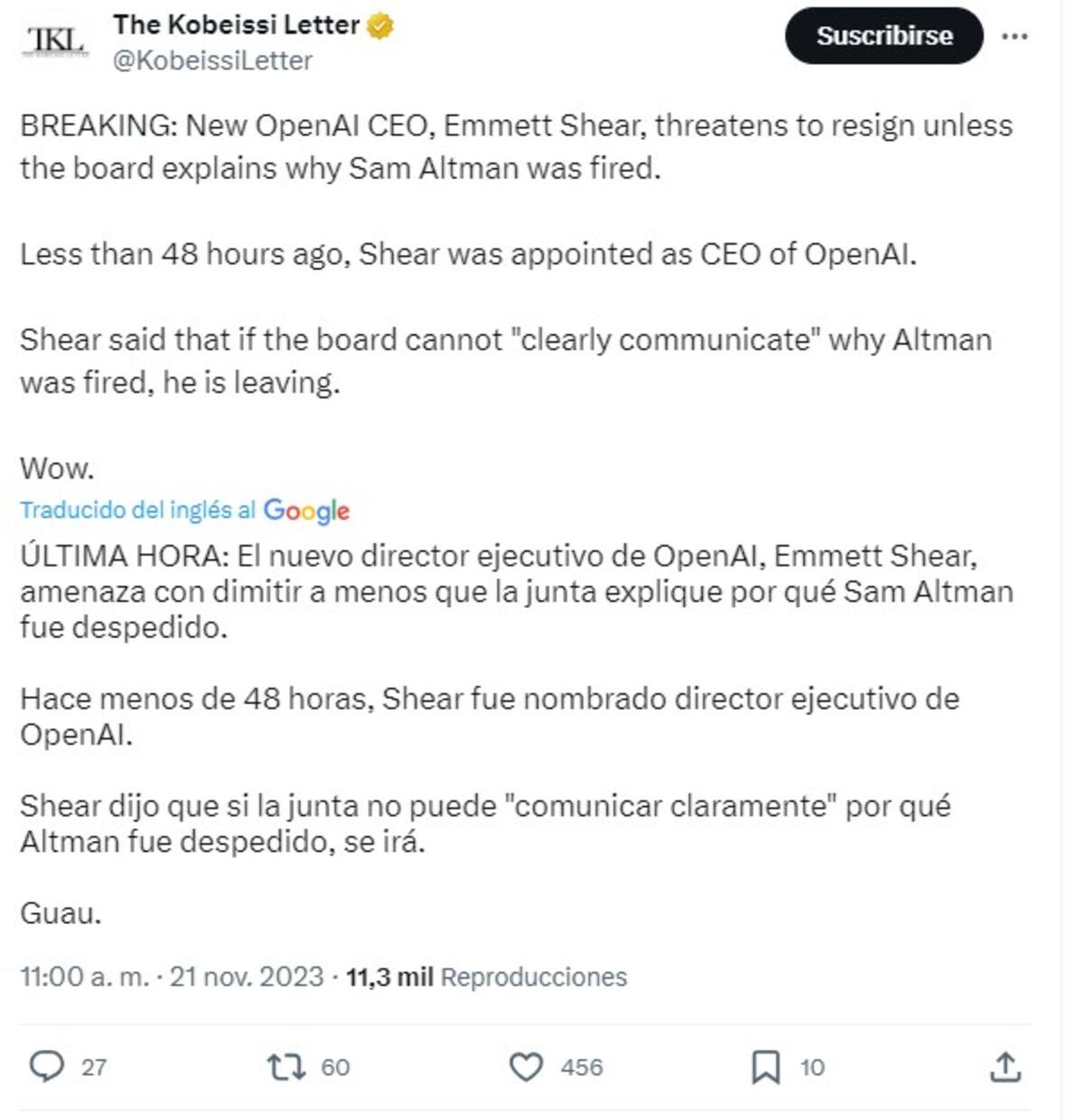 Luego del despido repentino de Sam Altman, OpenAI continúa bajo una situación compleja administrativamente. Emmett Shear, confundador de Twitch, fue anunciado como nuevo CEO, sin embargo, ni bien han pasado 48 horas desde su anuncio, un reporte de Bloomberg sostiene que Shear amenazó con renunciar a su nuevo cargo a menos de que la borda de directivos de OpenAI explique por qué Altman fue removido de su puesto.